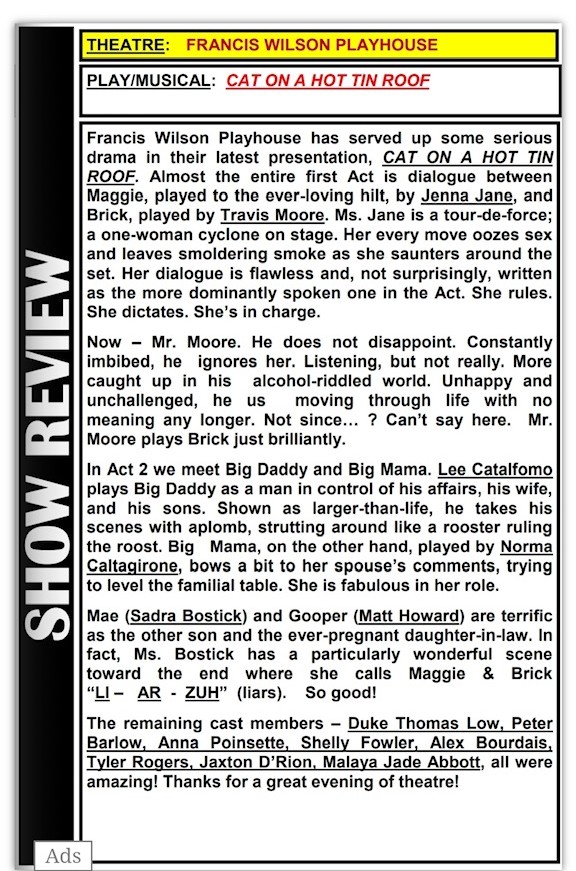 “Jane is a tour-de-force; a one-woman cyclone on stage. Her every move… leaves smoldering smoke as she saunters around the set. Her dialogue is flawless… She rules. She dictates. She’s in charge.”
